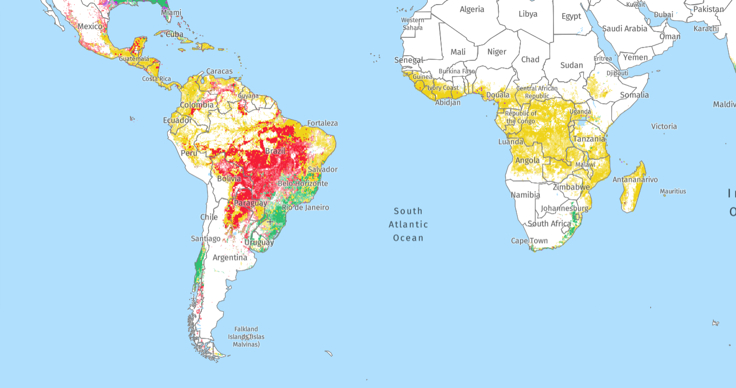 Die Grafik links zeigt in rot den Flächenverlust durch landwirtschaftliche Warenproduktion.